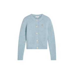 Dit gebreide vest van Josh V in fresh blue melange heeft een ronde halslijn en sluit met lichtkleurige knopen aan de voorzijde. Het kortere model valt tot op de heup en heeft een fijngebreide structuur met een zacht gemêleerd effect. Op de borst zie je een klein goudkleurig logo. De boordjes aan hals, manchetten en zoom zijn subtiel afgewerkt in ribbel. De fresh blue melange kleur geeft het vest een frisse, eigentijdse uitstraling.