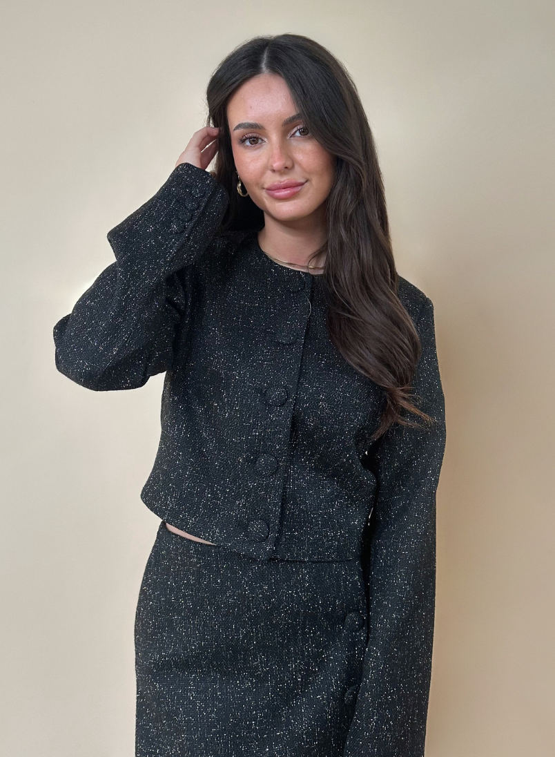 Combineer dit zwarte tweed jasje zoals gestyled met de bijpassende kokerrok voor een complete twinset. De cropped lengte van de Josh V jacket werkt perfect met hoge tailles. Draag het jasje open of gesloten, afhankelijk van de gelegenheid.