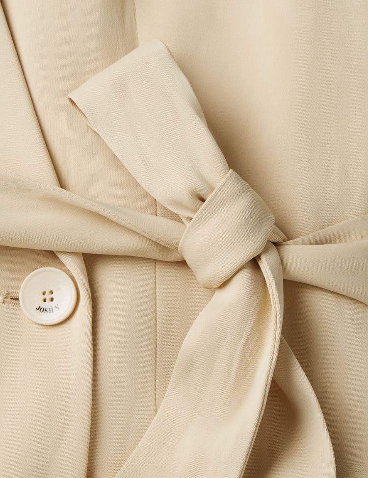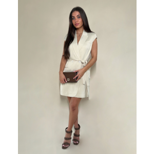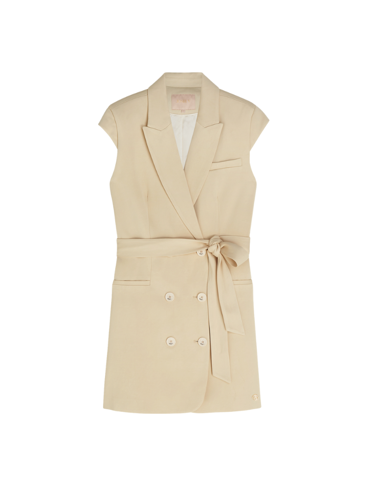 De Josh V Sterrin Dress in Light Beige is een elegante blazerjurk met een krachtige en vrouwelijke uitstraling. Het mouwloze model is uitgevoerd in een zachte, lichtbeige stof en heeft een dubbele knoopsluiting, reverskraag en een bijpassend strikceintuur dat de taille prachtig accentueert.