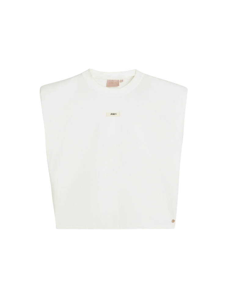 Het JOSH V Sue dames T-shirt in de kleur Off White is gemaakt van katoen. Het jersey T-shirt heeft een subtiel JOSH V-logo op de voorkant en is voorzien van schoudervullingen. Perfect voor een casual outfit met een stoer randje. Combineer het witte T-shirt met een jeans en sneakers of een sportieve jogger voor een stijlvolle look.