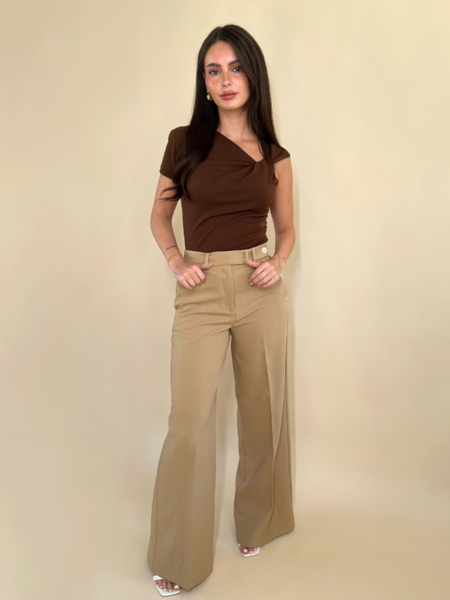 De Kyrie Pantalon heeft een elegante high-waist fit en een flatterend wide-leg silhouet. De rechte pijpen, subtiele persvouwen en bijpassende tailleband met knoopsluiting geven de pantalon een chique, minimalistische uitstraling. Het ontwerp maakt hem veelzijdig te combineren — draag hem met de blazer voor een complete, krachtige look of stijl hem los met een blouse of knitwear voor een meer ontspannen outfit.