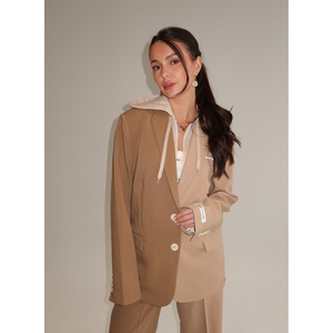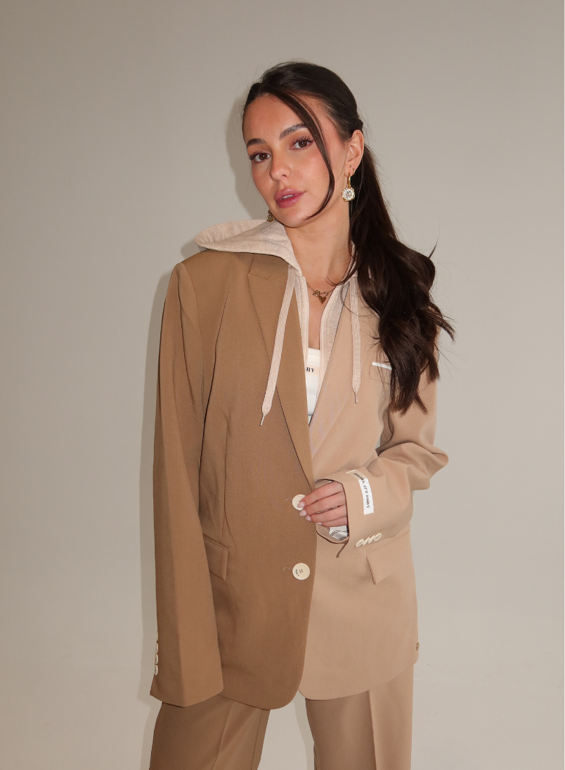 De Josh V Suus Hoodie – Khaki Light Camel is een unieke, high-fashion hoodie die is verwerkt in een two-tone blazer design. Het item combineert sportieve en chique elementen: een zachte hoodie in een bijpassende beige melange tint is geïntegreerd in een structured blazer met twee verschillende camel- en khakitinten. De blazer heeft klassieke details zoals flapzakken, een borstzak en een double-button sluiting, terwijl de hoodie voorzien is van een rits, koordjes en een comfortabele capuchon. Het subtiele goudkleurige JV-logo en het “Thanks, it’s JOSH V!” detail op de mouw maken de look compleet. Een stijlvol statement piece dat streetwear en tailoring moeiteloos samenbrengt.