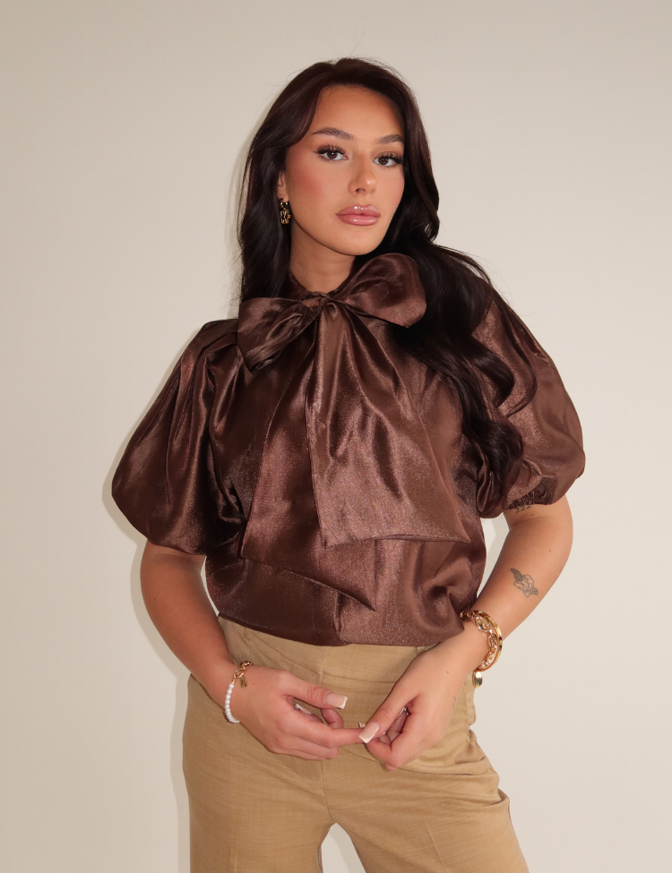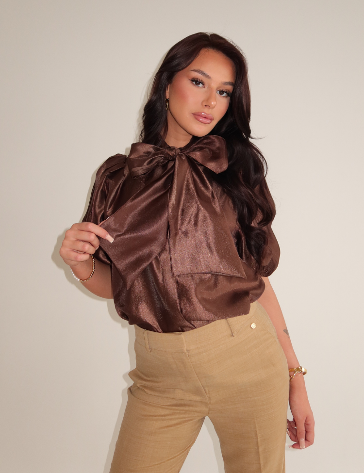 Deze bruine blouse van Josh V valt op door de volumineuze pofmouwen met elastiek aan de zoom. Het stuk heeft een klassieke kraag en een lange strik die je zelf kunt knopen. De glanzende stof geeft het bovenstuk een rijke uitstraling. De pasvorm is licht oversized met voldoende bewegingsruimte. Een goudkleurig merkembleem zit aan de onderzijde verwerkt. De blouse heeft een doorlopende sluiting aan de voorzijde en is uitgevoerd in een warme chocoladebruine tint.