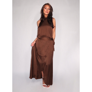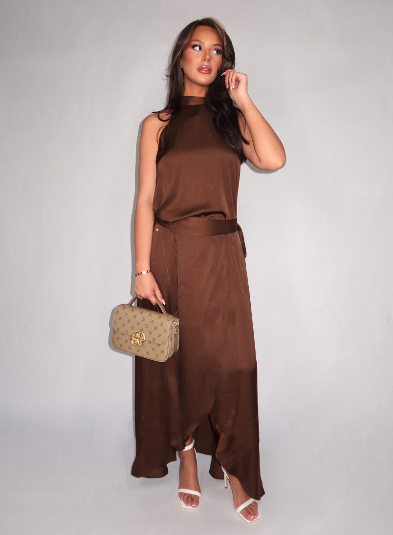 De Yamicia is een bruine maxi wikkelrok met een vloeiende val en een asymmetrische zoom. De rok sluit aan de zijkant met een zichtbare strikceintuur, waarmee je de tailleband naar wens aanpast. Een goudkleurig logo-detail aan de taille geeft het geheel een verzorgde afwerking. De soepele stof beweegt licht en valt strak langs het silhouet.