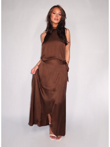 Een mouwloze top in diep bruin met een asymmetrische halslijn en een strikdetail op één schouder. De loshangende strik loopt door als een sierlijke strook stof over de voorkant. De vlot vallende stof heeft een lichte glans en een soepele structuur. Afgewerkt met een subtiel goudkleurig logo-label aan de zoom.