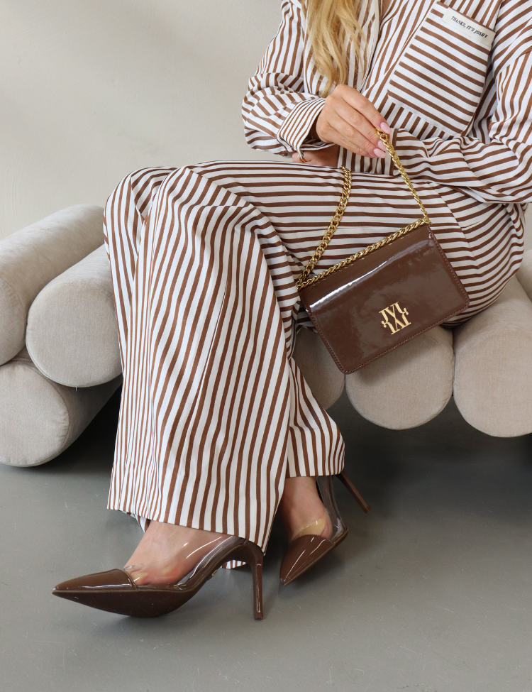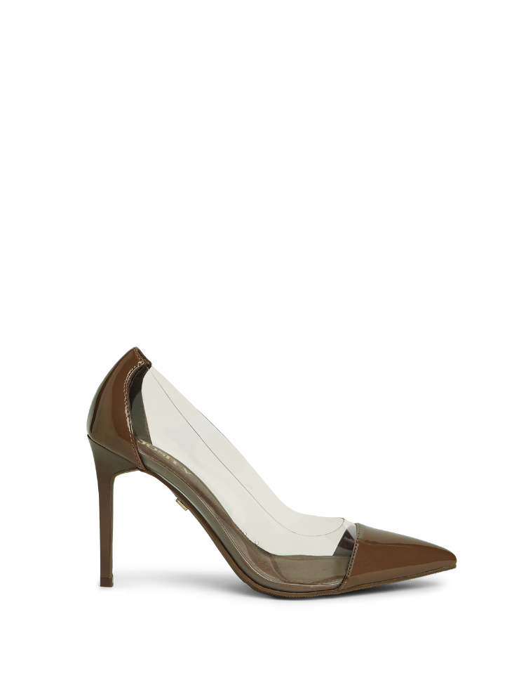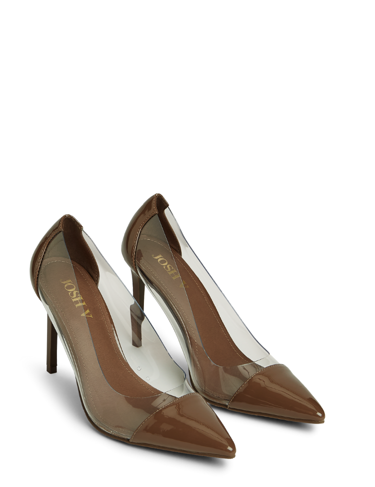 De Josh V Zyra heels in bruin combineren transparante details met een elegante patent finish. Deze pumps hebben een spitse neus, een stevige hak van circa 9 cm en een comfortabele inlegzool. De transparante zijpanelen geven de klassieke pump een moderne twist en zorgen voor een luchtige, verfijnde uitstraling.