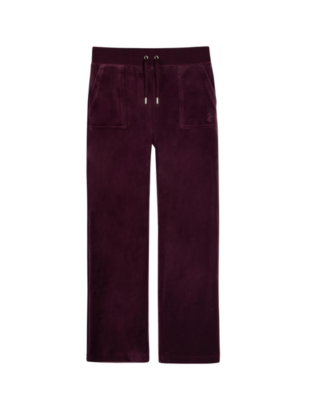 Deze straight leg trackpants van Juicy Couture zijn uitgevoerd in luxe velours in een diepe winetasting kleur. De sportieve broek heeft een elastische tailleband met koord en goudkleurige eyelets. Aan de voorzijde zitten twee ingestoken zakken met een extra opgezette zak met klepje, afgewerkt met drukknopen. Het geborduurd JC-logo op het been geeft het kledingstuk een subtiele merkuitstraling. Het fluweelachtige materiaal combineert comfort met een rijke, luxe look.