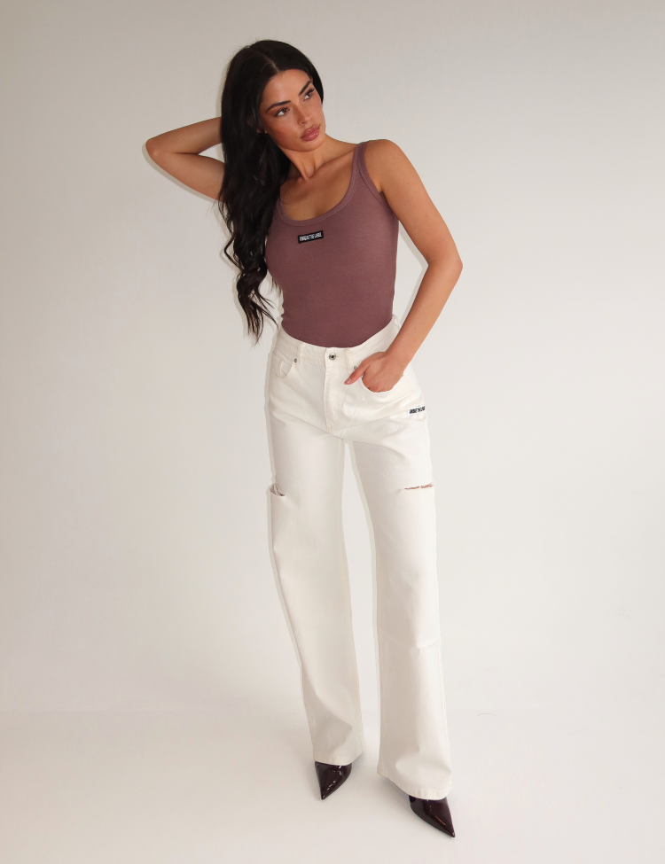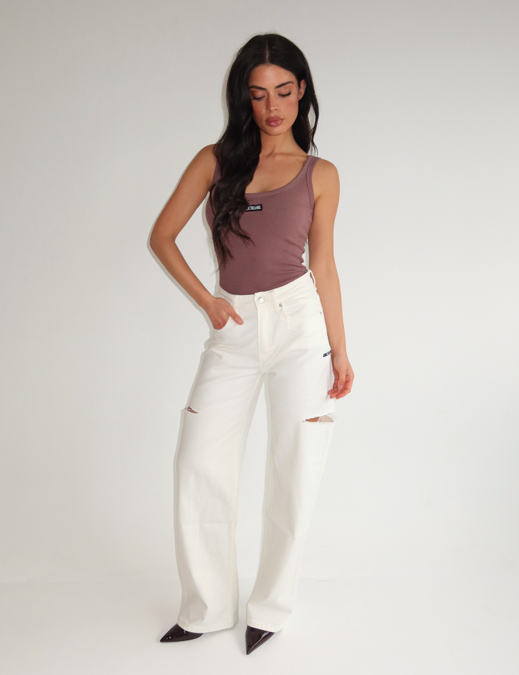 Deze off white wide leg jeans van Unique The Label heeft een rijke denim structuur met opvallende destroyed details op de bovenbenen. Het vijf-pocket model met knoop- en ritssluiting zit comfortabel hoog in de taille. De wijde pijpen vallen soepel vanaf de heupen voor een relaxed silhouet. Het zwarte labelpatch op de zijzak geeft deze trendy broek een subtiel merkaccent.