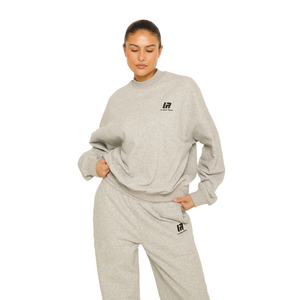 Deze grijze sweater heeft een hoge ronde hals en een relaxte pasvorm. Aan de voorzijde zie je een zwart logo met de tekst LA Sisters Official. Vervaardigd uit zachte sweaterstof met geribbelde afwerking aan de hals, mouwen en zoom. De verlengde mouwen geven een comfortabele fit. Het logo keert terug op de bijpassende joggingbroek, ook in grijs met dezelfde textuur.