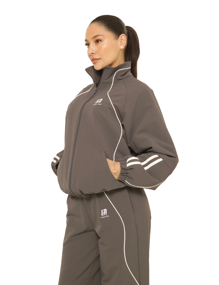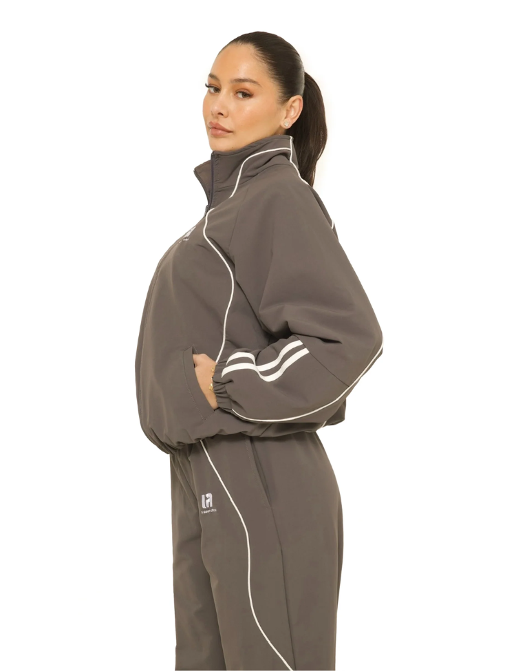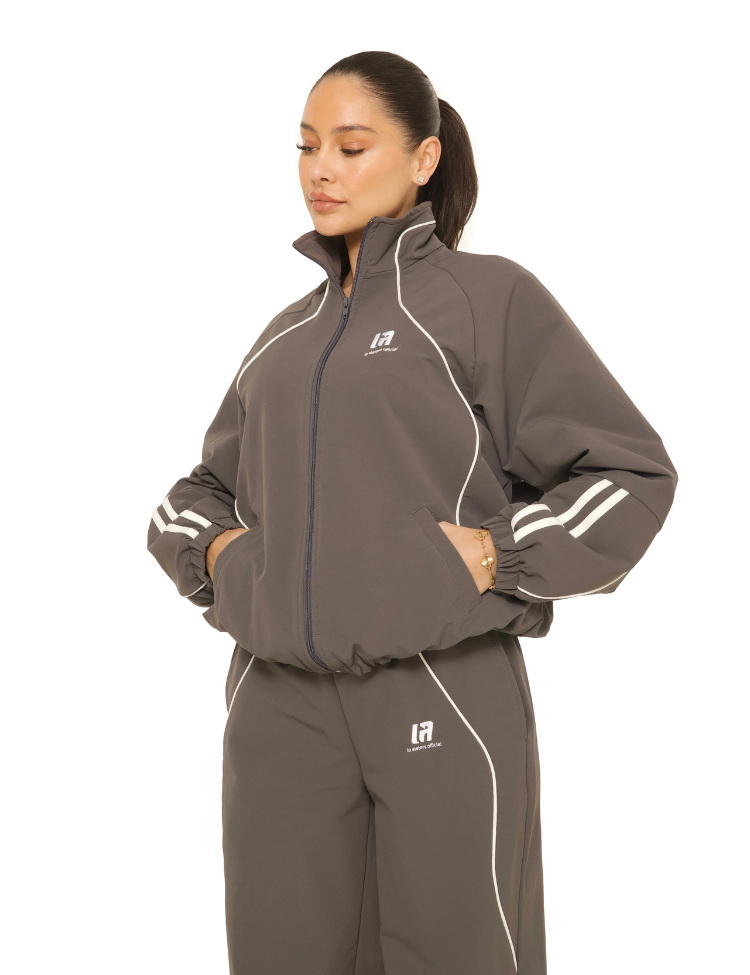 Deze grijze zip-up jacket van La Sisters heeft een relaxed silhouet met een opstaande kraag en ritssluitng aan de voorzijde. Witte paspels lopen langs de naden en over de mouwen, gecombineerd met dubbele strepen op de manchetten. Op de borst staat het "LA Official" logo. De elastische boord aan de onderkant geeft de jas een afgeronde, sportief-strakke afwerking. Zijzakken met insteekmogelijkheid completeren het geheel.