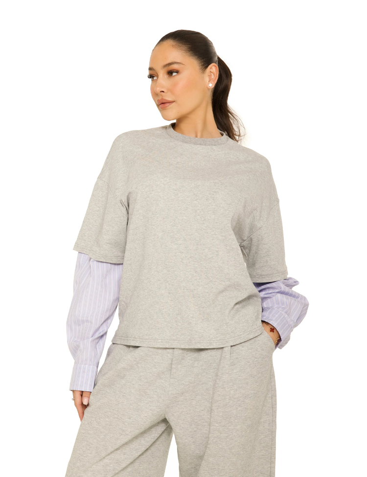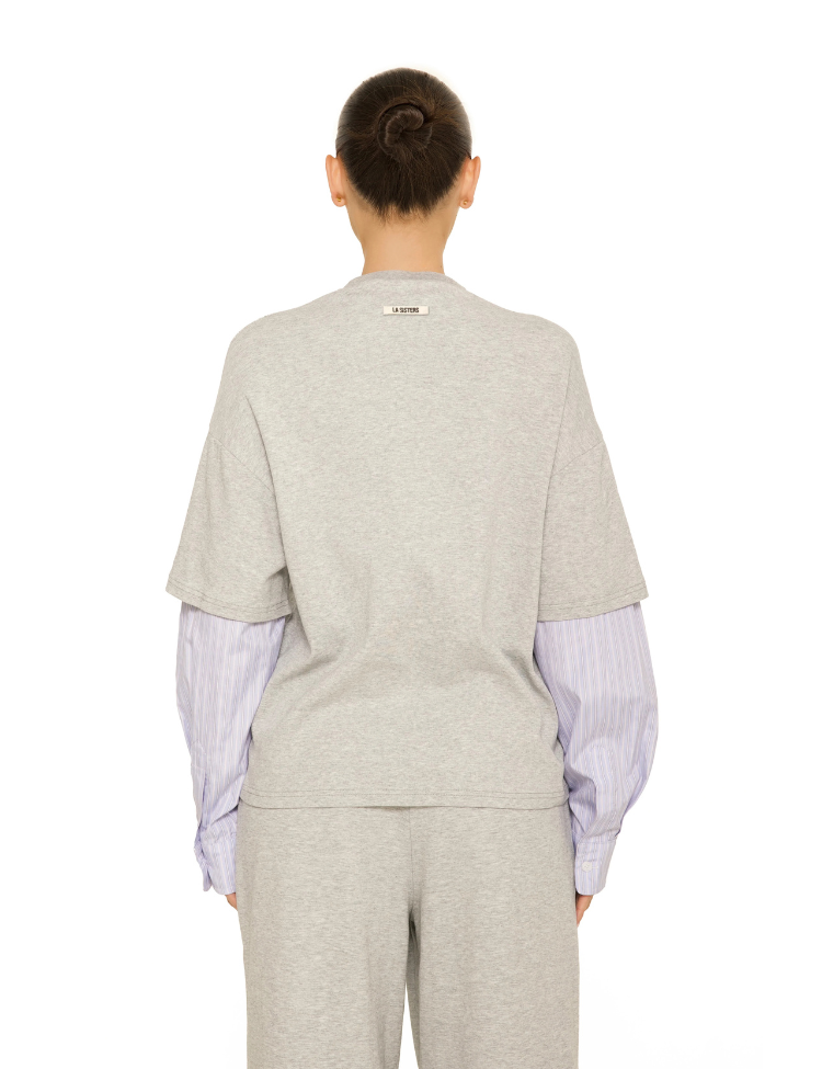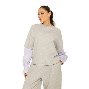 Deze grijze blouse van La Sisters combineert een relaxed sweatshirt met gestreepte blousemouwen voor een speelse twist. De korte mouwen van het bovenstuk zijn uitgevoerd in zachte sweatstof met een subtiele melange, terwijl de onderliggende mouwen een fijn gestreept patroon in wit en lila hebben. De hoge hals met geribbelde afwerking geeft het design een verfijnde finish. De rechte pasvorm zorgt voor comfort en gemak, perfect voor een laagjes look met een eigentijds karakter.