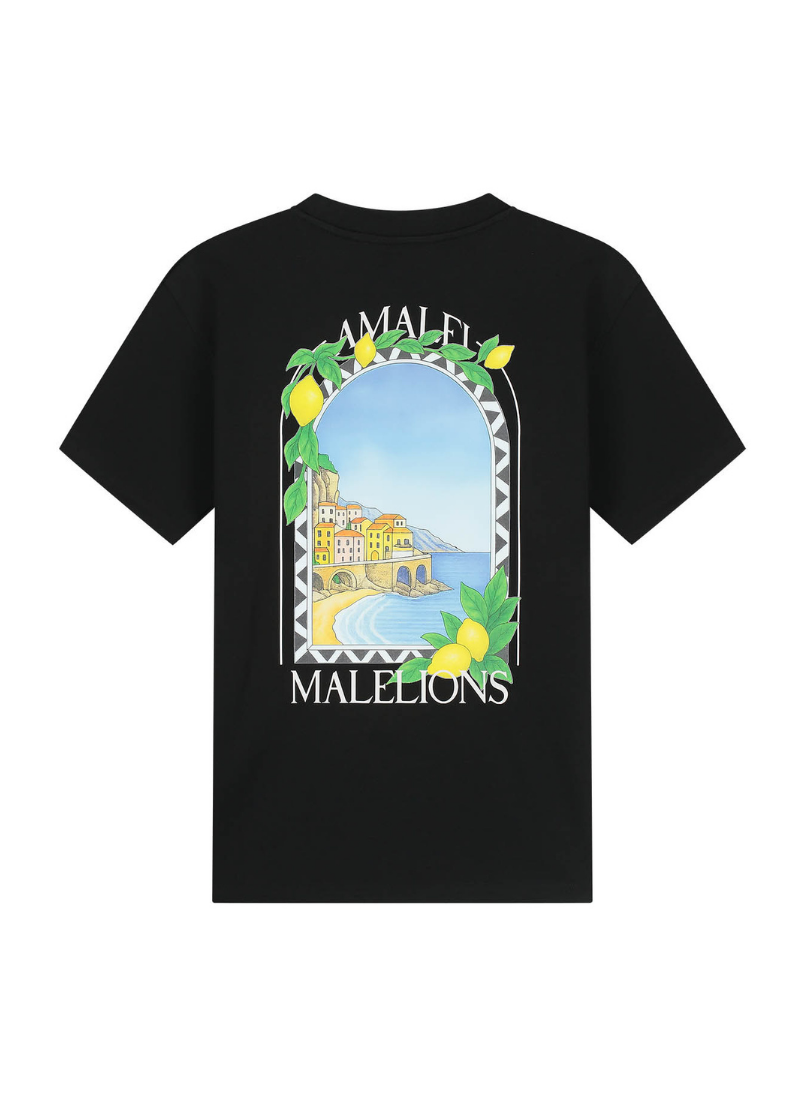Dit zwarte t-shirt van Malelions combineert comfort met een opvallende grafische print. Het shirt heeft een klassieke ronde hals en korte mouwen voor een relaxte pasvorm. Op de borst prijkt een compacte rechthoekige print met een kleurrijk Amalfi-kustlandschap, omlijst door citroenen en bladeren. De achterzijde toont dezelfde illustratie in groter formaat, aangevuld met de tekst "AMALFI" en "MALELIONS". Het zachte katoenen materiaal voelt comfortabel aan tijdens je dagelijkse bezigheden. Perfect voor wie houdt van streetwear met een mediterrane twist.
