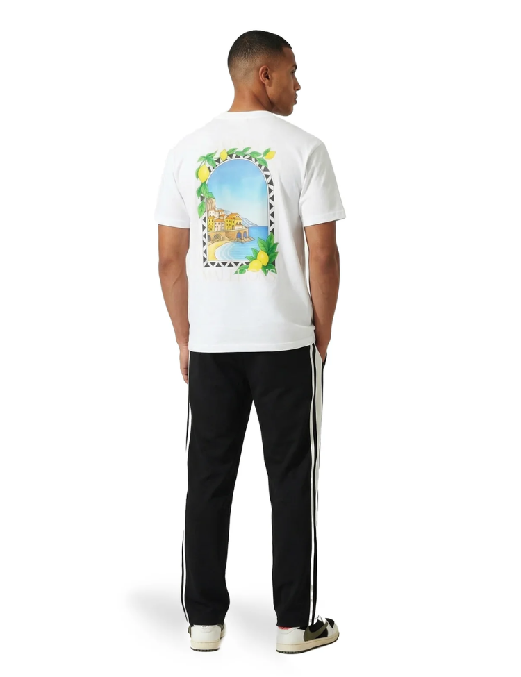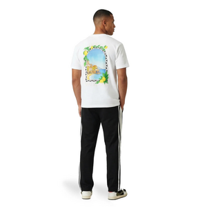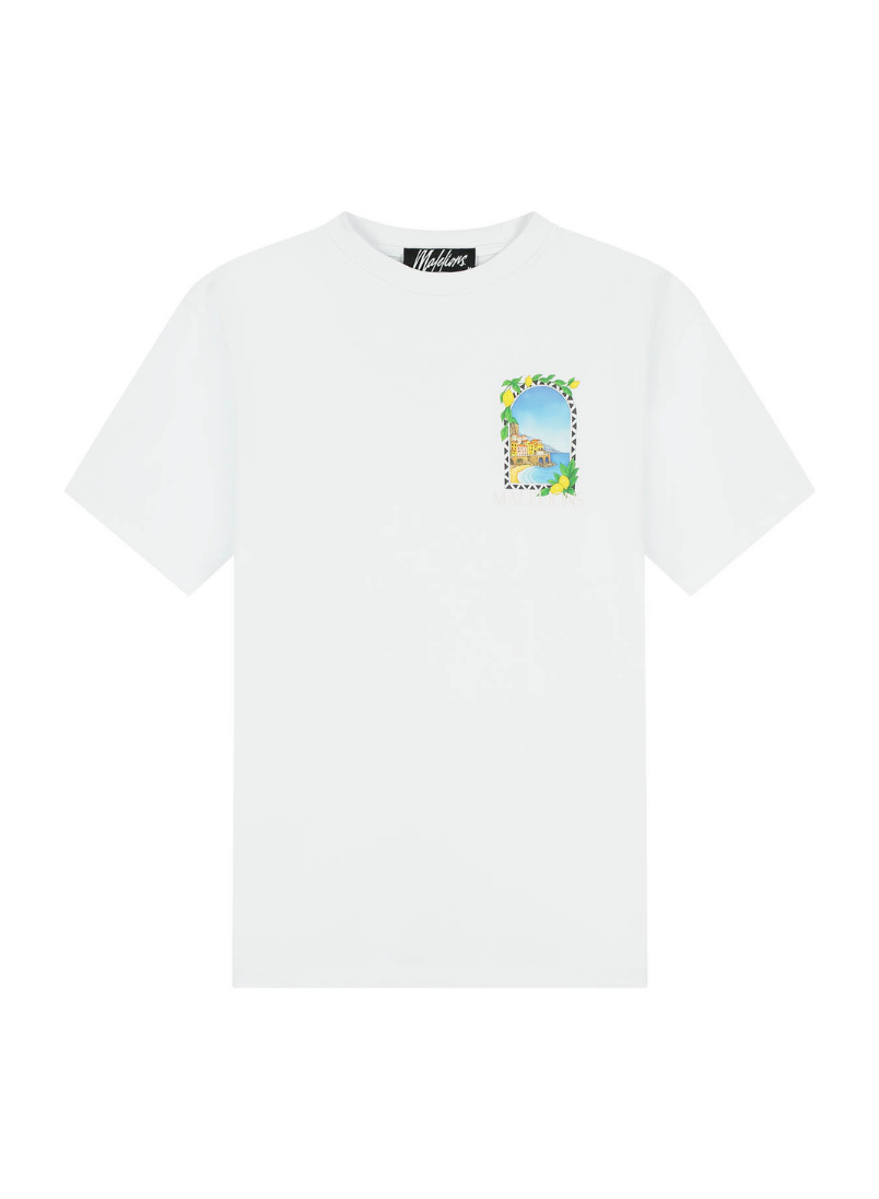 Dit witte T-shirt van Malelions combineert een relaxte pasvorm met een opvallende grafische print. Op de borst zie je een compact venster-design met een mediterraan kustlandschap, omlijst door citroenen en groene bladeren. De achterkant toont dezelfde illustratie in groot formaat: een kleurrijk tafereel van gele en oranje gebouwen aan de kust, versierd met citroentakken en een geometrische rand. Het shirt heeft een ronde hals en korte mouwen voor een comfortabele regular fit die je de hele dag door draagt.