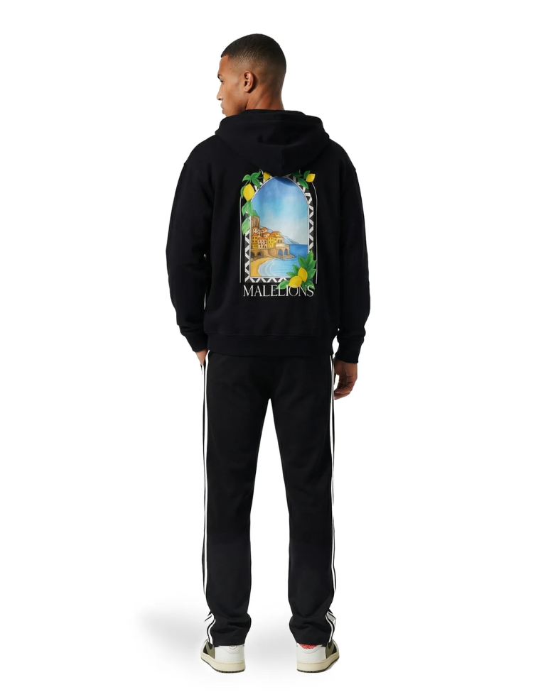 Deze zwarte hoodie van Malelions combineert sportief comfort met een opvallende Amalfi-print. Het vest heeft een doorlopende ritssluiting en capuchon voor extra draaggemak. Op de borst prijkt een kleurrijke window-print met citroenen en een Italiaans kustlandschap, omlijst met de tekst "Amalfi" en "Malelions". De achterkant toont dezelfde eyecatching graphics in groot formaat. Ribboorden bij de mouwen en zoom zorgen voor een perfecte pasvorm. Deze zip-up hoodie geeft je streetwear look direct die trendy twist waar je naar zoekt.