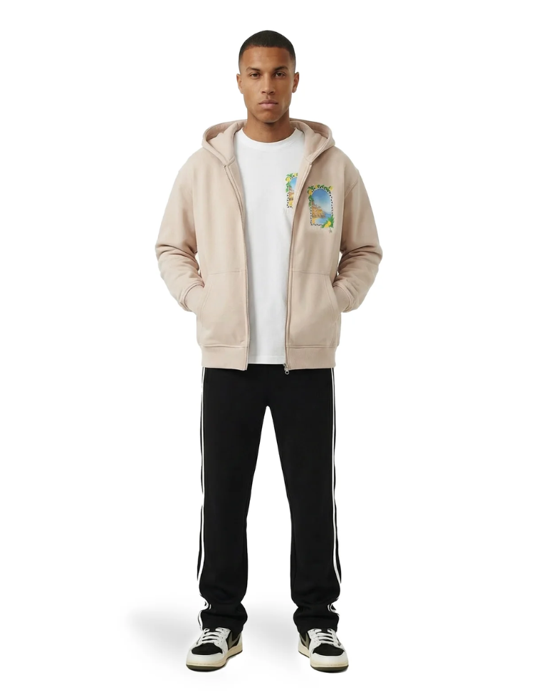 Deze lichtroze hoodie met rits heeft een comfortabele capuchon en steekzakken aan de voorzijde. Op de borst en rug zie je een kleurrijke grafische print met een Italiaans kustlandschap, omlijst door citroenen en groene bladeren. De print toont architectuur aan zee in een decoratief venster met geometrisch patroon. Ribboorden aan de mouwen en zoom zorgen voor een perfecte pasvorm. Deze zachte sweatvest combineert streetwear met vakantievibes voor je dagelijkse look.
