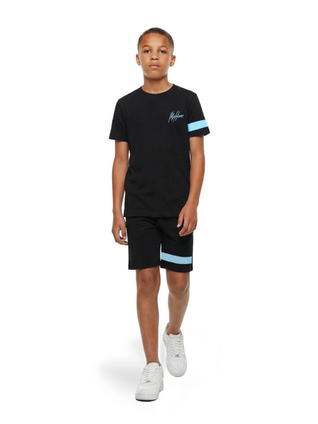 Deze zwarte korte broek van Malelions voor kids heeft een sportieve look met een lichtblauwe streep en "Malelions" tekst op het linkerbeen. De shorts hebben een elastische tailleband voor een comfortabele fit. Aan de voorzijde zitten twee steekzakken en aan de achterzijde één paspelzak. Een stoere korte joggingbroek die perfect past bij warme dagen.