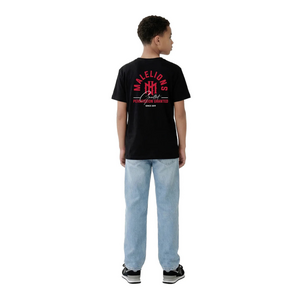 Dit zwarte kids t-shirt van Malelions heeft een stoere uitstraling met rode tekstprint op de borst en rug. Het shirt heeft korte mouwen en een ronde hals met sportieve afwerking. Op de voorzijde staat het Malelions logo met "Permission Granted" tekst in opvallende rode letters. De achterkant toont een groter design met "Malelions", "Juellist" en "Since 2019" prints. Het comfortabele katoenen shirt heeft een regular fit die je kind de hele dag prettig draagt.