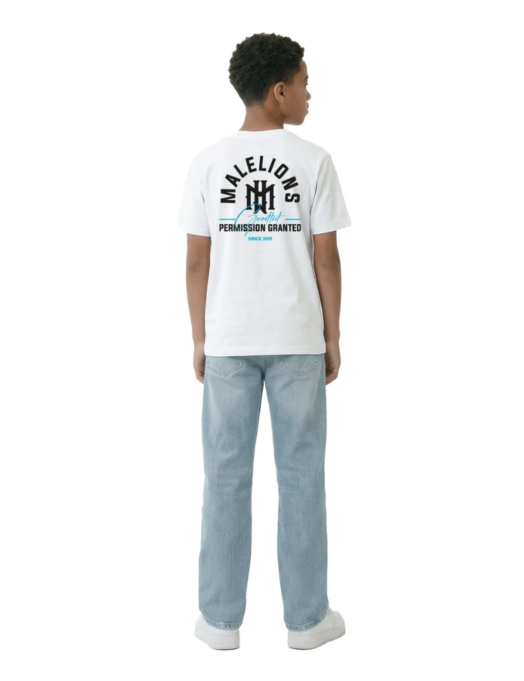 Dit witte kinder t-shirt van Malelions combineert sportieve frisheid met stoere branding. Het shirt heeft een klassieke ronde hals en korte mouwen voor optimaal draagcomfort. Op de borst zie je het kenmerkende Malelions logo met de tekst "Permission Granted" in zwarte letters. De achterzijde toont een groter logodesign met blauwe accenten en "Since 2019" vermelding. Het zachte katoenen materiaal voelt lekker aan op de huid en biedt je kids de vrijheid om te bewegen en spelen.