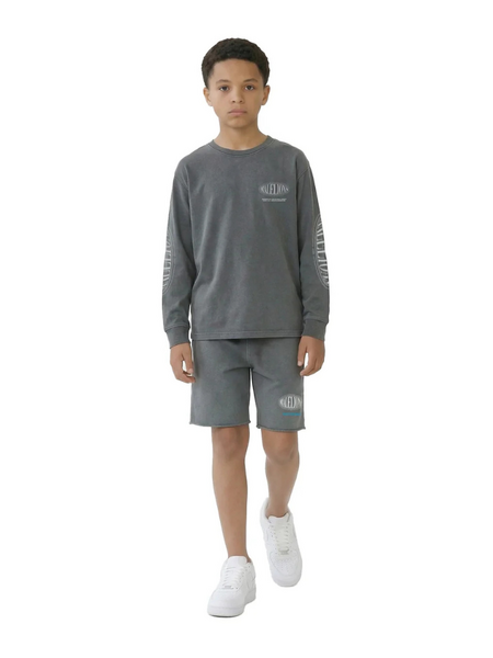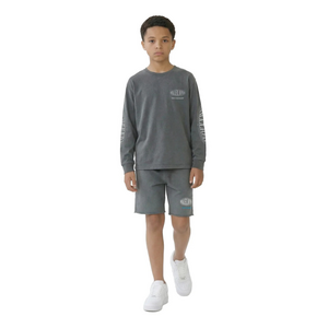 Deze stoere kindershorts van Malelions heeft een acid wash afwerking die je direct opvalt. Het grijze broekje krijgt extra karakter door de gerafelde zoom onderaan. De elastische tailleband met koord zorgt voor comfort tijdens het spelen en bewegen. Twee steekzakken aan de voorkant bieden ruimte voor kleine schatten. Op de linkerpijp staat de kenmerkende Malelions print met blauwe accenten. De relaxte pasvorm geeft je bewegingsvrijheid voor alle avonturen.