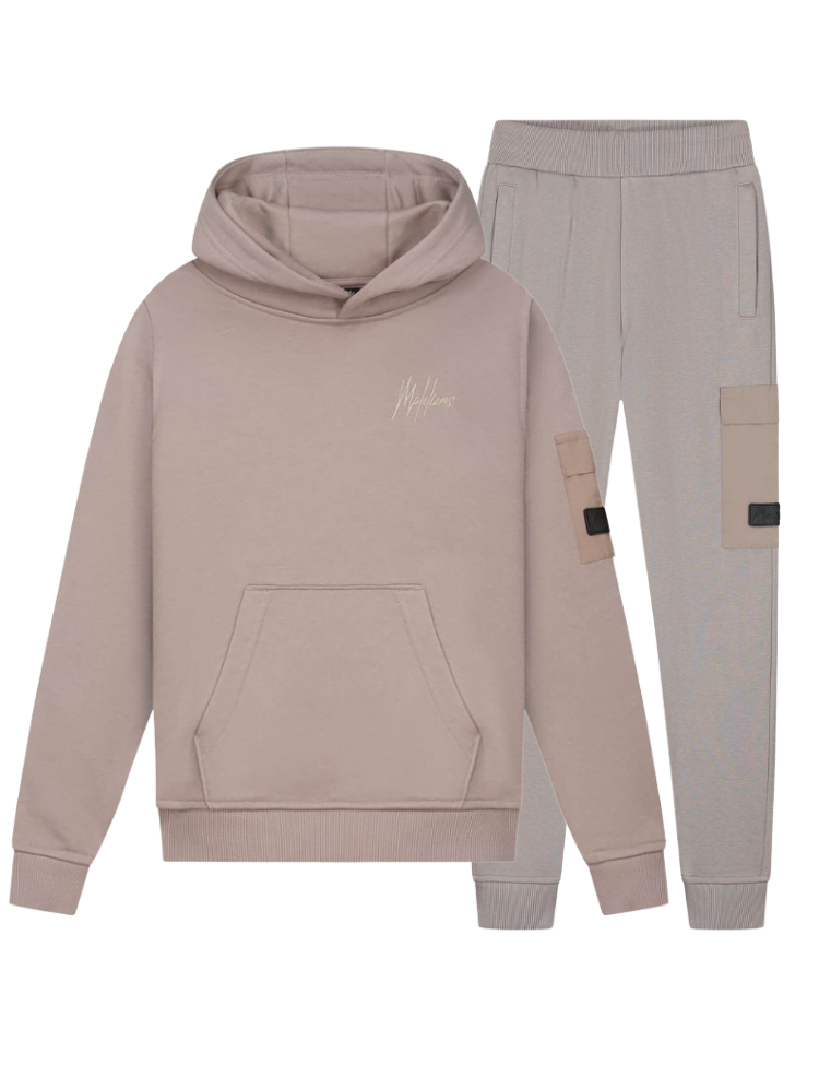 Deze stoere kindertracksuit bestaat uit een hoodie met kangoeroezak en joggingbroek in grijsbruin. De capuchon heeft trekkoorden voor optimale pasvorm. Subtiele Malelions-branding siert de borst. De joggingbroek heeft elastische taille met ribboorden aan de enkels. Beide items zijn voorzien van praktische zakken met nylon accenten in contrasterende tinten. Het setje combineert sportief comfort met streetstyle details die je kind graag draagt.