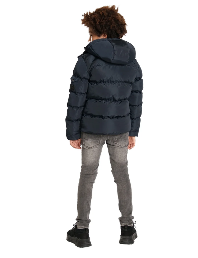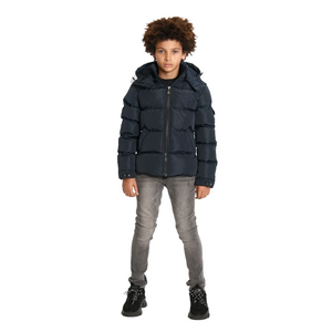 Deze donkerblauwe winterjas voor kinderen combineert warmte met streetwear stijl. De gewatteerde puffer jacket heeft een afneembare capuchon met verstelbare koordjes en drukknoppen voor extra bescherming. De doorlopende ritssluiting met windvanger zorgt voor praktisch comfort. Twee steekzakken met ritsen bieden veilige opbergruimte. Het Malelions logo siert subtiel de borst, terwijl een patch op de mouw de signature look compleet maakt. De elastische boorden bij de polsen en zoom houden de kou buiten.