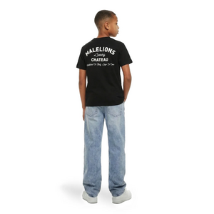 Dit zwarte kids t-shirt van Malelions heeft een opvallende gebreide kraag met ribdetail. Op de borst staat een compacte witte print met de teksten "Malelions", "Luxury", "Chateau" en "Established In Italy, Lago Di Como". Dezelfde print komt groter terug op de rug. De relaxed fit zorgt voor een comfortabele pasvorm, ideaal voor een casual streetwear look.