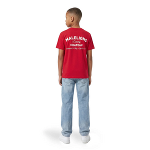 Dit rode kids t-shirt van Malelions heeft een relaxed fit en een gebreide kraag met ribdetail. Op de borst staat een compacte witte print met de teksten "Malelions", "Luxury", "Chateau" en "Established In Italy, Lago Di Como." Op de rug keert dezelfde print groter terug. De korte mouwen en rechte snit zorgen voor een comfortabele pasvorm.