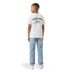 Dit witte kids t-shirt van Malelions heeft een opvallende gebreide kraag die het shirt een geraffineerde twist geeft. Op de borst vind je een compacte "Malelions Luxury Chateau" print, terwijl dezelfde tekst op de achterzijde groter terugkomt met de vermelding "Established In Italy, Lago Di Como". De relaxed fit zorgt voor een lekker losse pasvorm. Korte mouwen en een strakke geribde halsopening maken dit shirt compleet.