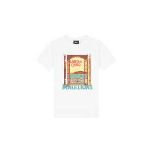 Dit relaxed fit kinder T-shirt van Malelions combineert comfort met een stoere uitstraling. Het off-white shirt heeft een opvallende rechthoekige print op de borst met "LAGO DI COMO" tekst in warme kleuren. De illustratie toont een raam met uitzicht op water, omlijst door decoratieve details. Onderaan de print staat "MALELIONS" in turquoise letters. De ronde hals en korte mouwen zorgen voor bewegingsvrijheid. Perfect voor jonge trendsetters die van unieke designs houden.