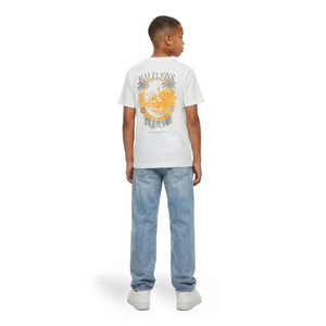 Dit off-white Malelions kids T-shirt heeft een relaxed fit met ronde hals en korte mouwen. Op de borst staat een subtiele "Malelions" tekstprint in grijs. De achterzijde valt op met een groot grafisch design in oranje en grijs, met palmbomen, de tekst "Malelions Del Lago" en een illustratie. Het neklabel draagt het kenmerkende Malelions script.