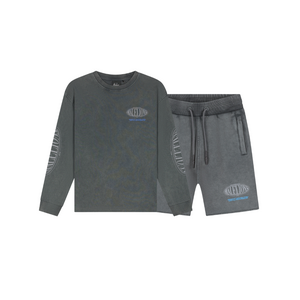 Deze stoere kindercombi-set bestaat uit een longsleeve shirt en bijpassende shorts in een trendy acid wash grijs. Het shirt heeft een ronde hals en lange mouwen met opvallende Malelions prints op de borst en langs de mouwen. De comfortabele shorts zijn voorzien van een elastische tailleband met trekkoord, steekzakken en dezelfde kenmerkende Malelions branding op het been. De acid wash afwerking geeft beide kledingstukken een unieke, vintage uitstraling die perfect past bij de relaxte streetwear stijl waar kids dol op zijn.