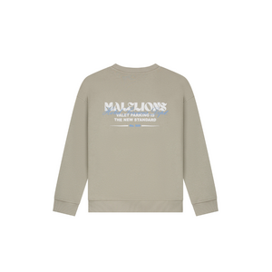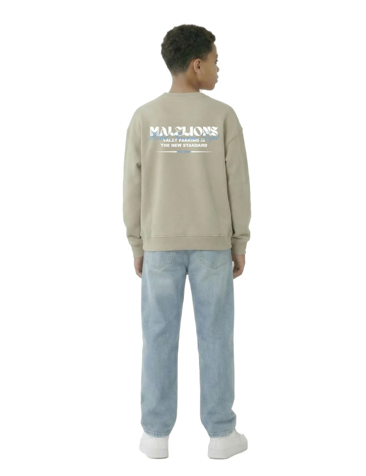 Deze relaxed fit kindersweater in olijfgroen heeft een ronde hals en lange mouwen met geribde boorden. Op de borst zie je een witte Malelions tekstprint, terwijl de achterzijde voorzien is van een grotere print met de tekst "Valet Parking Is The New Standard". De trui heeft een comfortabele pasvorm door de zachte katoenblend en geribde zoom die voor extra bewegingsvrijheid zorgt.