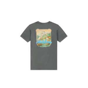 Dit relaxed fit kinder T-shirt heeft een stoere acid wash afwerking in grijs. Het shirt is voorzien van een ronde hals en korte mouwen. Op de voorkant zie je een ovale print met de tekst "Malelions" in blauwe letters. De achterkant toont een grote grafische print met twee witte reigers in een natuurlijke setting, omlijst met de tekst "Malelions" en "Lago di Como". De verwassen look geeft het shirt een vintage uitstraling die perfect past bij de sportieve streetwear stijl van het merk.