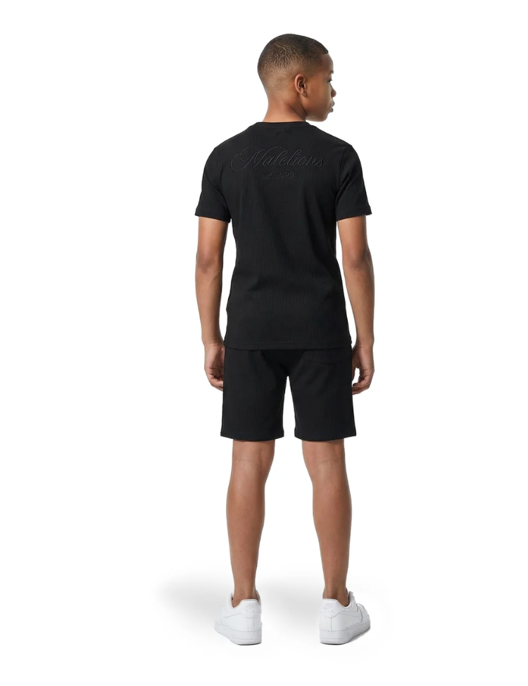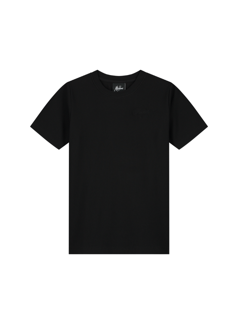 Dit zwarte kinder T-shirt van Malelions combineert sportieve looks met trendy details. Het shirt heeft een opvallende ribstructuur die over het hele kledingstuk doorloopt, wat zorgt voor extra textuur en een moderne uitstraling. De ronde halsboeg met klein label geeft het shirt een verzorgde afwerking. Met korte mouwen en een comfortabele pasvorm is dit shirt ideaal voor actieve kids die er stijlvol uit willen zien. De zwarte kleur maakt het shirt veelzijdig en gemakkelijk te combineren met verschillende outfits.