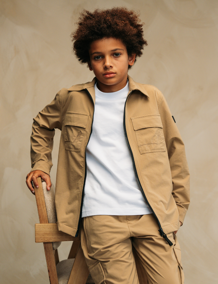 Twee grote borstzakken met klepsluiting geven het overshirt een stoere utility-look, subtiel afgewerkt met een ton-sur-ton logo embroidery. De kraag en manchetten maken het design extra strak en veelzijdig. Draag het overshirt open over een basic tee voor een casual look, of gesloten als tussenjas tijdens frisse lentedagen. Ideaal voor school, een citytrip of gewoon chillen met vrienden.