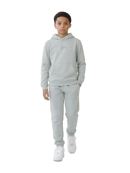 De grijze hoodie past perfect bij de bijpassende joggingbroek voor een complete Malelions look. De witte sneakers maken het sportieve ensemble af.