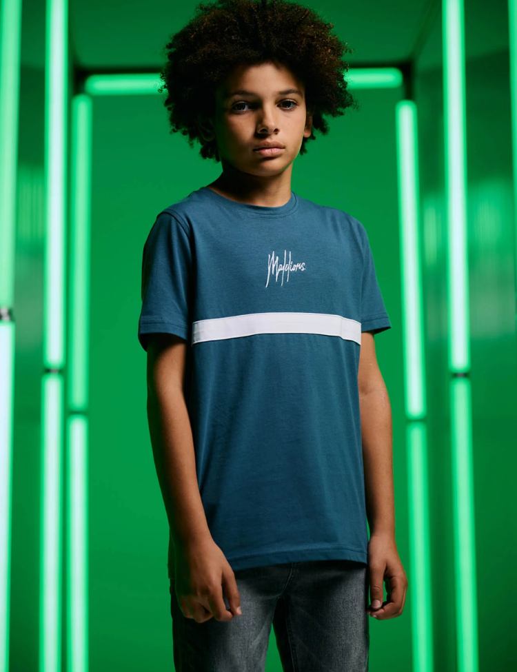 Dit teal kleurige kinder T-shirt heeft een opvallend horizontaal streepdesign met een witte baan over de borst. Het shirt is voorzien van het kenmerkende Malelions logo in witte letters op de voorkant. De ronde hals en korte mouwen geven dit shirt een klassieke pasvorm. Het zachte materiaal zorgt voor draagcomfort tijdens het spelen en bewegen. Perfect voor jonge trendsetters die sportief en stoer voor de dag willen komen.