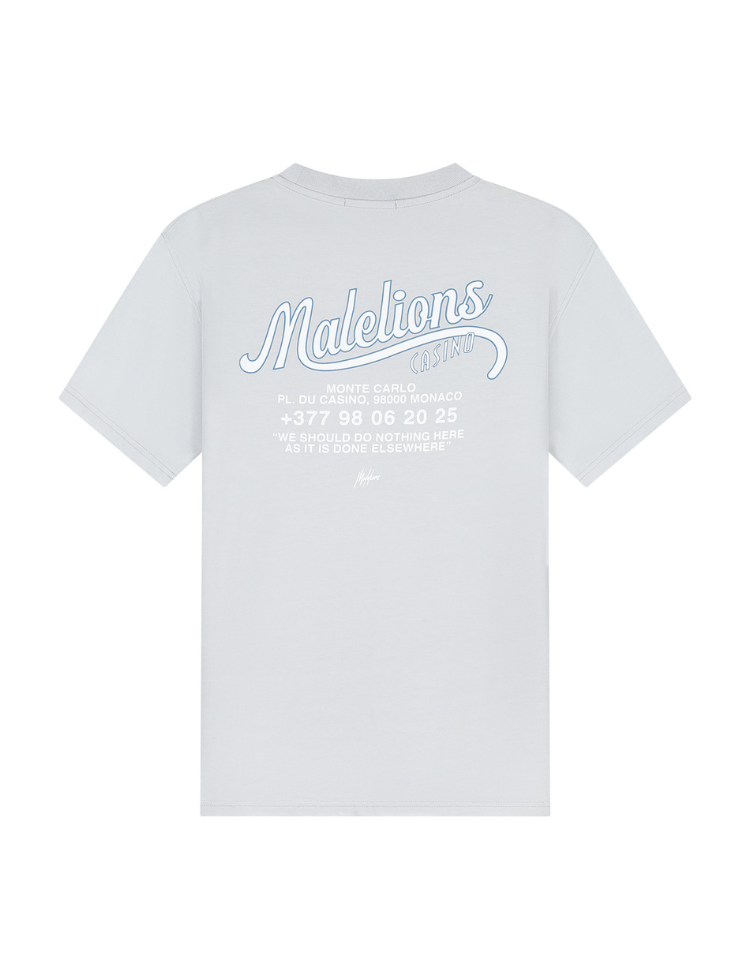 Dit grijze T-shirt van Malelions kenmerkt zich door de kenmerkende Casino print op de achterzijde. Het shirt heeft een klassieke ronde hals en korte mouwen voor een relaxte pasvorm. Op de borst prijkt het Malelions logo in een subtiele toon-op-toon uitvoering. De achterkant toont "Malelions Casino" met onderliggende tekstregels en coördinaten. Het oceaangrijze katoen voelt zacht aan en biedt je de hele dag comfort.