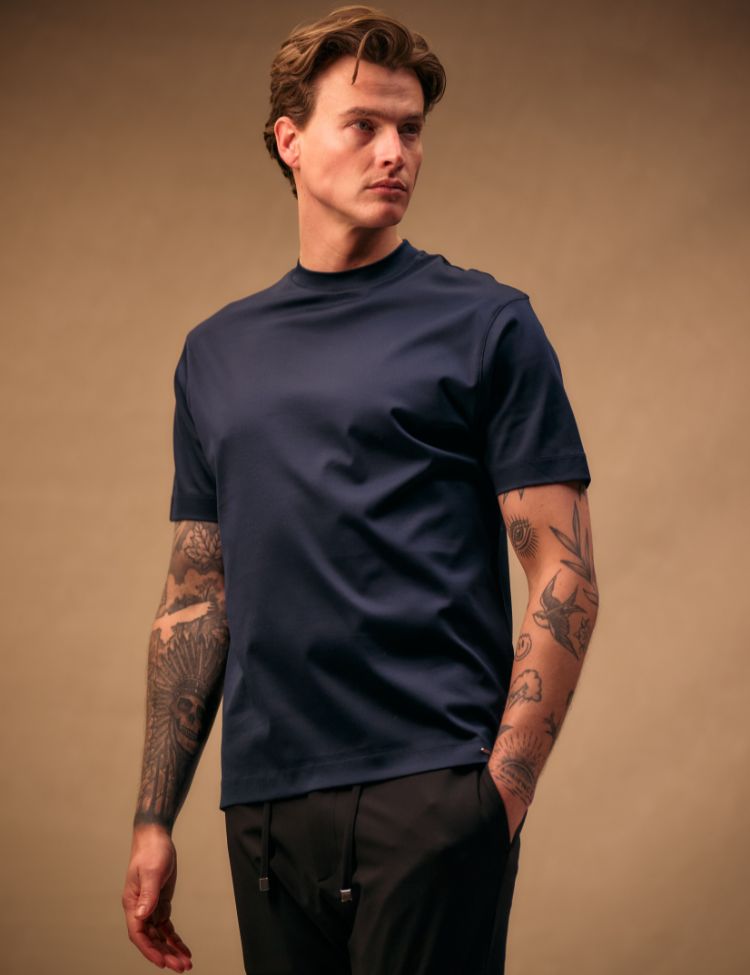 De regular fit van dit Malelions t-shirt sluit mooi aan zonder te knellen. Combineer het navy shirt met de zwarte broek voor een strakke, moderne outfit die je zowel overdag als 's avonds kunt dragen.