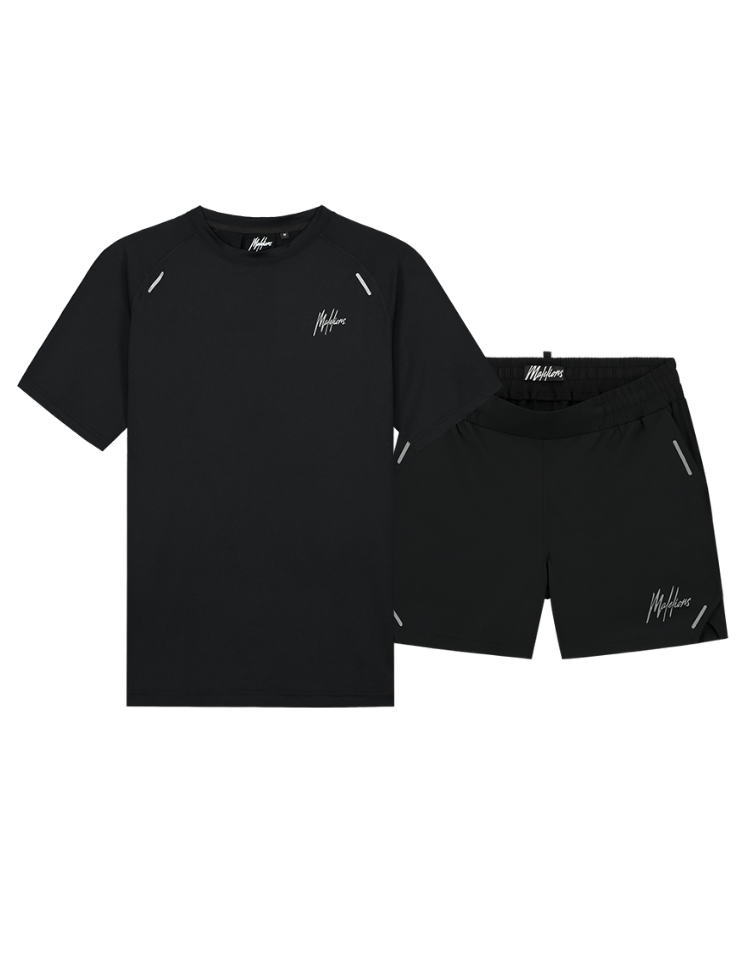Deze sportieve padel set van Malelions bestaat uit een zwart shirt met korte mouwen en bijpassende shorts. Het shirt heeft een hexagon patroon en subtiele reflecterende details op de schouders. De signature Malelions branding staat op de linkerkant van de borst. De shorts zijn uitgevoerd met dezelfde branding aan de zijkant. Beide kledingstukken hebben een regular fit die je bewegingsvrijheid geeft tijdens het sporten. Perfect voor op de padelbaan of andere sportieve activiteiten waarbij je er stijlvol uit wilt zien.