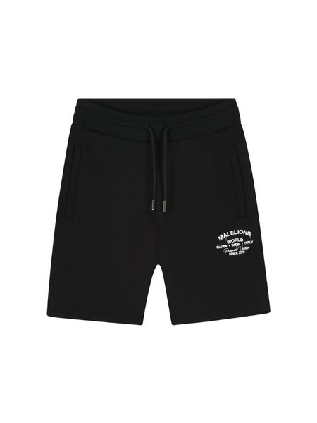 Dit zwarte twinset bestaat uit een oversized T-shirt met ronde hals en bijpassende shorts. Beide items zijn voorzien van witte tekstopdrukken met "Malelions World" en locatiedetails op de borst. De shorts hebben een elastische tailleband met trekkoord voor optimaal draagcomfort. Het T-shirt heeft korte mouwen en een relaxte pasvorm. De shorts vallen ruim tot net boven de knie. Perfect voor warme dagen wanneer je sportief en stijlvol voor de dag wilt komen.