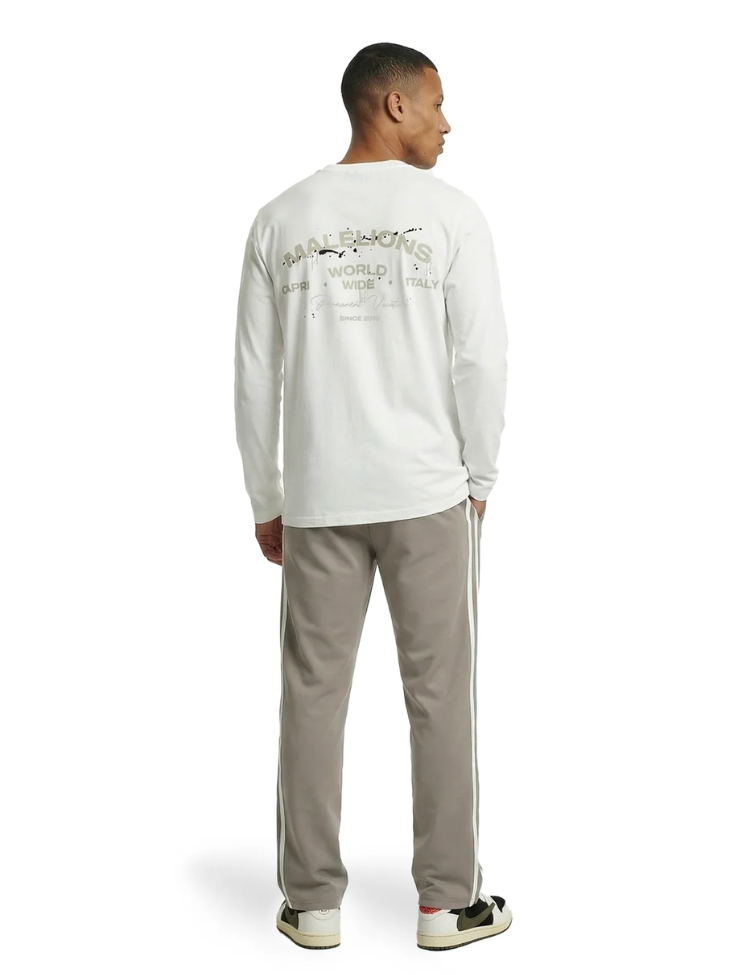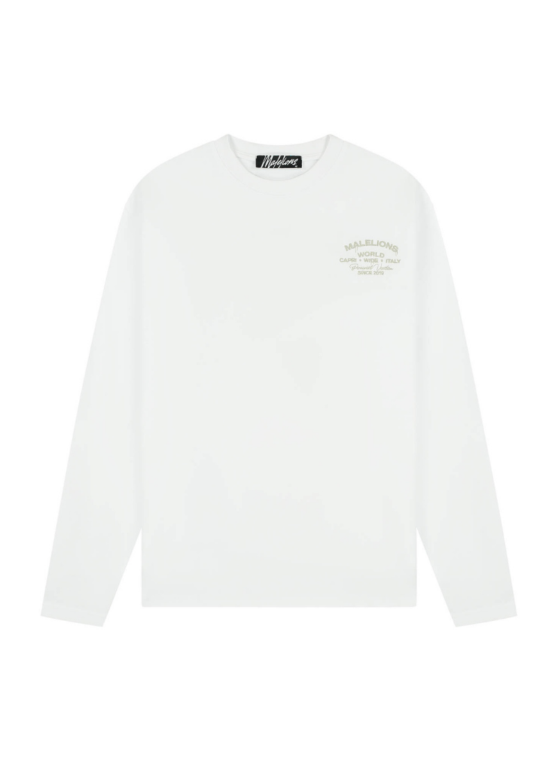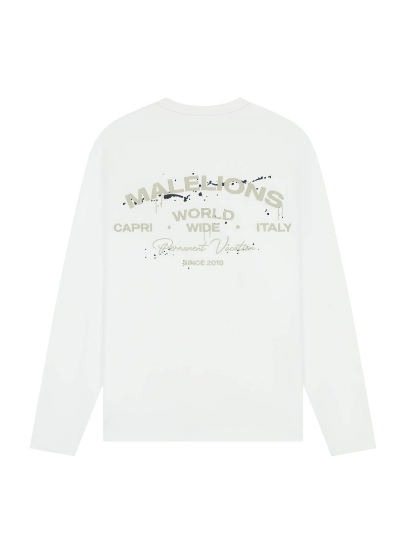 Deze witte longsleeve van Malelions heeft een ronde hals en lange mouwen die perfect aansluiten. Op de voorzijde zie je subtiele tekstprints in lichtgroene tinten met "Malelions World Capri Wide Italy" en "Permanent Vacation Since 2019". De achterkant toont dezelfde tekst in een groter formaat met verfspetters als artistiek detail. Het zachte materiaal zorgt voor optimaal draagcomfort tijdens je dagelijkse activiteiten. De relaxte pasvorm geeft je bewegingsvrijheid terwijl de ribboorden bij de hals, mouwen en zoom voor een nette afwerking zorgen.