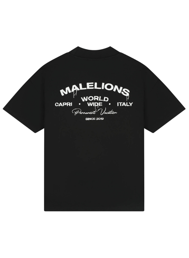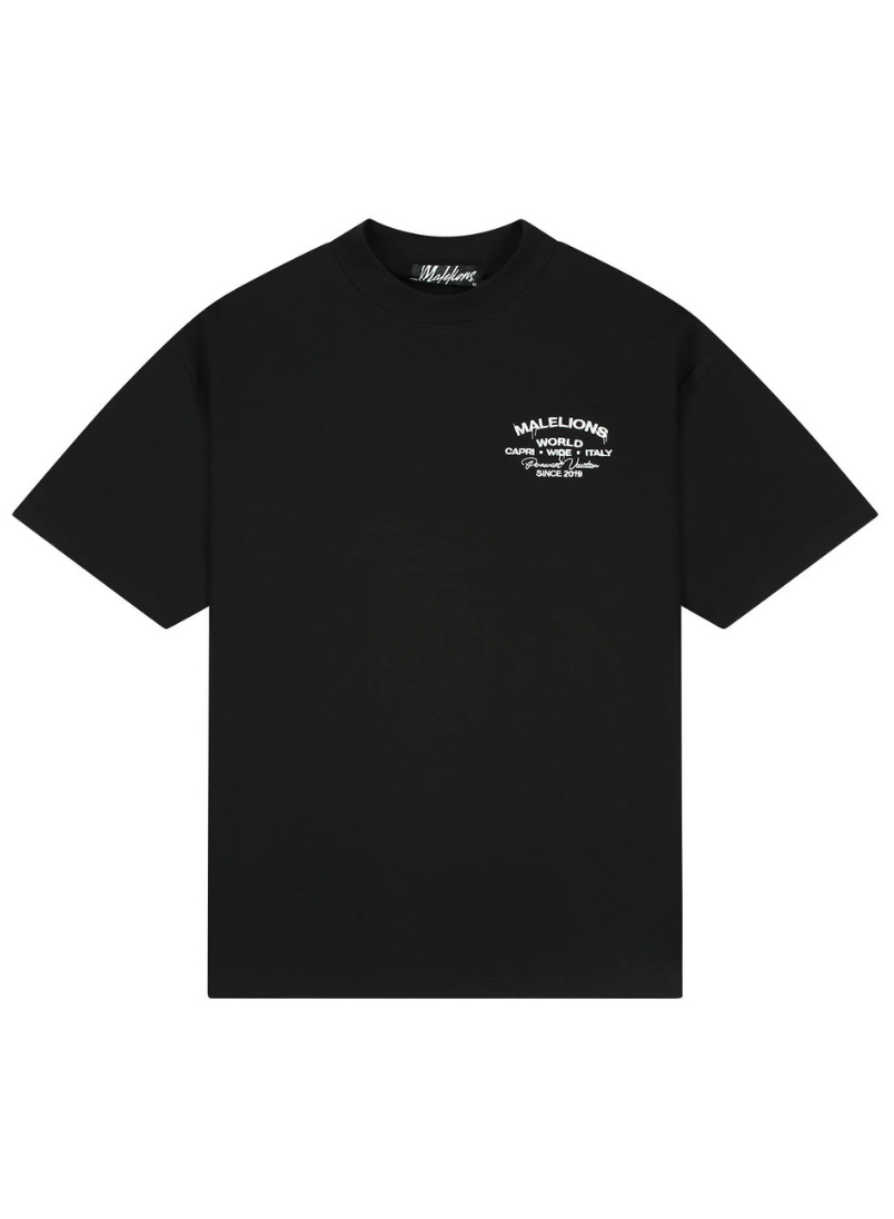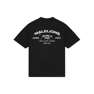 Dit zwarte T-shirt van Malelions combineert een relaxte pasvorm met kenmerkende branding. Het shirt heeft een ronde hals en korte mouwen voor een klassieke casual look. Op de voorkant staat een compacte witte tekstprint met "Malelions World" en locatiedetails. De achterkant toont een grotere print met "Malelions", "World", "Capri", "Wine", "Italy", "Permanent Vacation" en "Since 2019". Het oversized model geeft je bewegingsvrijheid en zorgt voor een trendy, sportieve uitstraling die perfect past bij streetwear outfits.