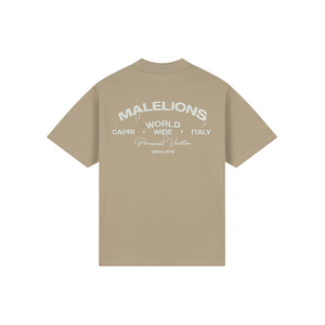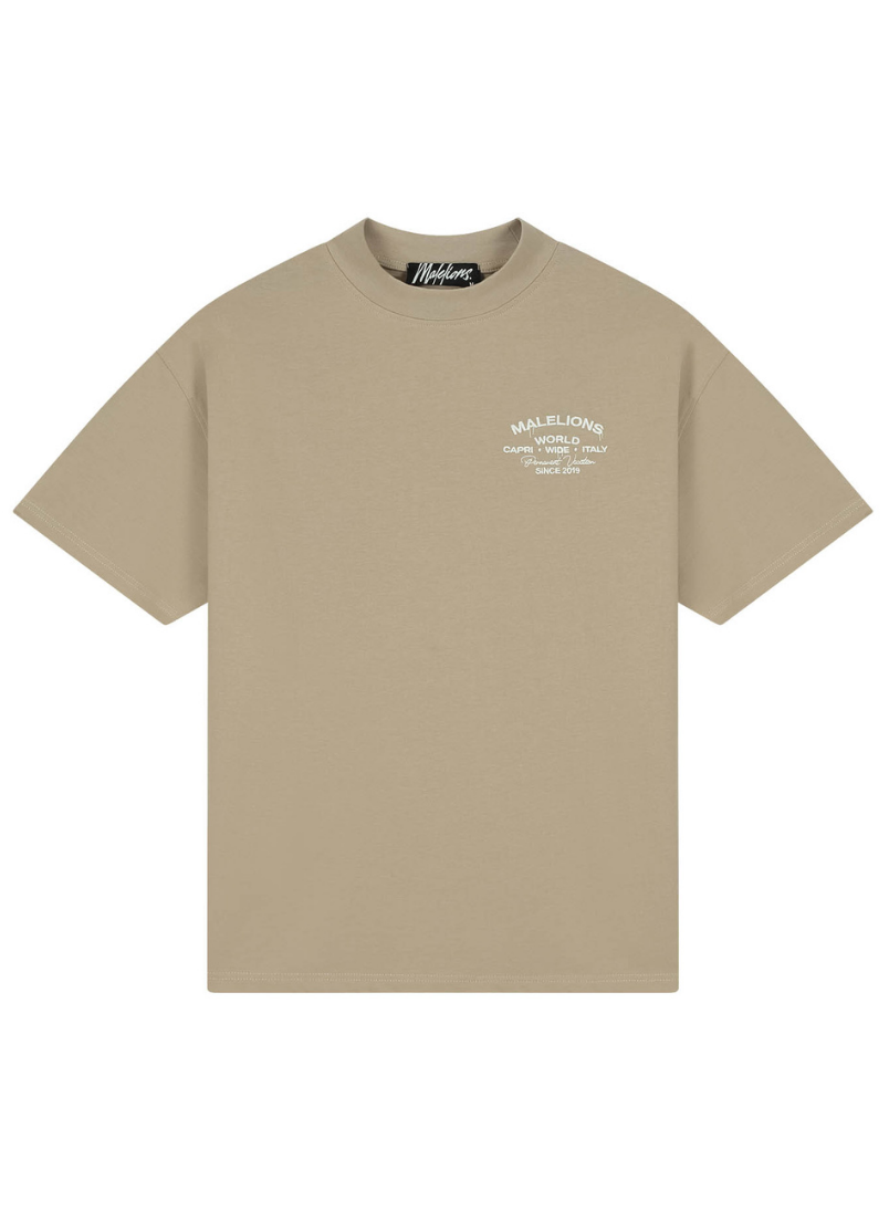 Dit relaxte T-shirt in sage brown heeft een oversized fit met een ronde hals en korte mouwen. Op de borst zie je een subtiele witte tekstprint met "Malelions World" en "Capri Wide Italy" details. De achterkant toont een grotere print met dezelfde tekst plus "Permanent Vacation" in sierlijk schrift. Het shirt is gemaakt van comfortabel katoen met een zachte afwerking. De neutrale kleur maakt het een veelzijdig basic item dat je eindeloos kunt combineren in je garderobe.