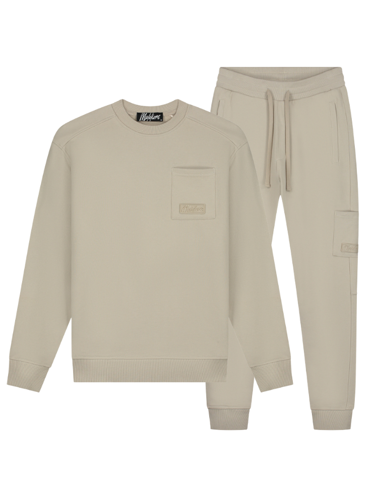 Deze complete trainingspak set bestaat uit een sweater met borstzak en bijpassende joggingbroek in light taupe. De sweater heeft een ronde hals en raglan mouwen voor bewegingsvrijheid. Op de linkerborst zit een opgestikte zak met tonal logo patch. De joggingbroek beschikt over een elastische tailleband met koord, steekzakken en een cargo zak op het linkerbeen met dezelfde logo detaillering. Beide delen zijn afgewerkt met geribde boorden voor een perfecte pasvorm.