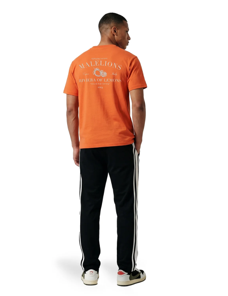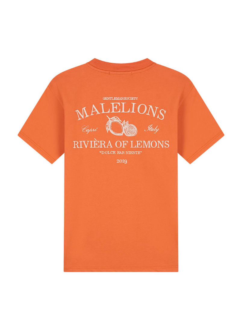 Dit koraal oranje t-shirt van Malelions combineert sportieve vibes met stoere details. De opvallende tekstprint met citroenen illustratie op de achterkant geeft deze shirt extra karakter. Op de voorzijde zie je een compacte print op borsthoogte met de tekst "Gentleman Society", "Malelions" en "Riviera of Lemons". Het klassieke ronde halsmodel en de regular fit zorgen voor comfort tijdens je dagelijkse moves. De korte mouwen maken dit basic shirt perfect voor warme dagen of als laagje onder je favoriete hoodie.