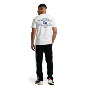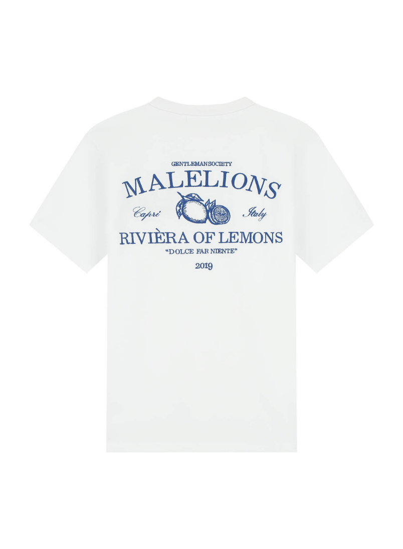 Dit witte T-shirt van Malelions heeft een ronde hals en korte mouwen voor een klassieke pasvorm. Op de voorkant zie je een blauwe tekstprint met "Gentleman Society", "Malelions", "Capri Italy" en "Riviera of Lemons" inclusief citroengrafiek. Op de achterkant staat dezelfde tekst grootser afgebeeld met "Dolce Far Niente" en jaartal 2019. Het shirt is gemaakt van comfortabel katoen dat lekker zit tijdens je dagelijkse activiteiten. De regular fit zorgt voor bewegingsvrijheid zonder dat het te ruim valt.