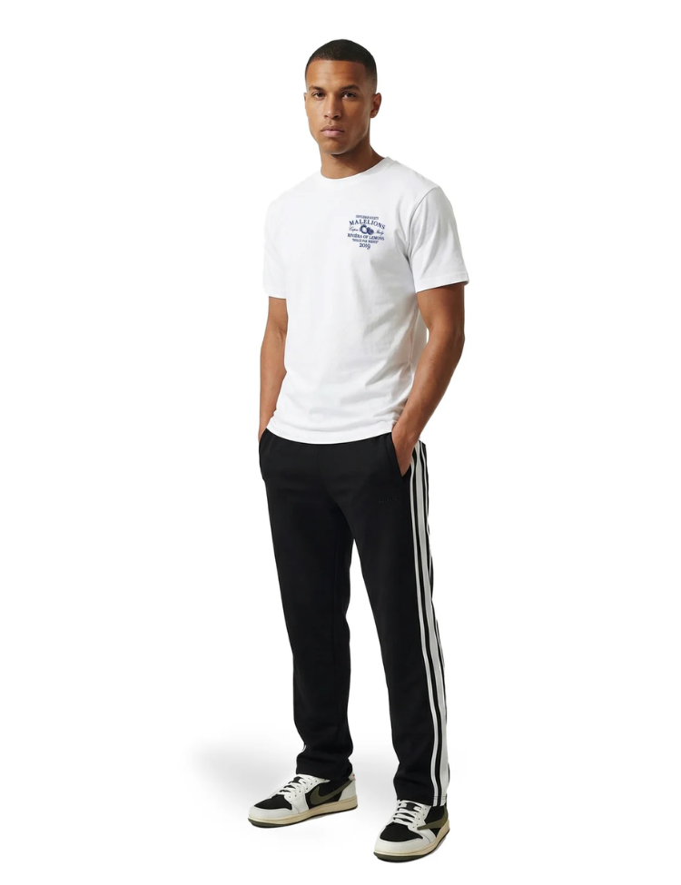 Dit Malelions shirt combineer je relaxed met de zwarte joggingbroek met witte strepen langs de zijkant. De sneakers in beige-groene tinten maken je streetwear look compleet.