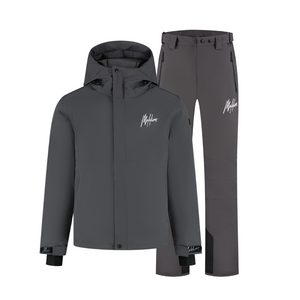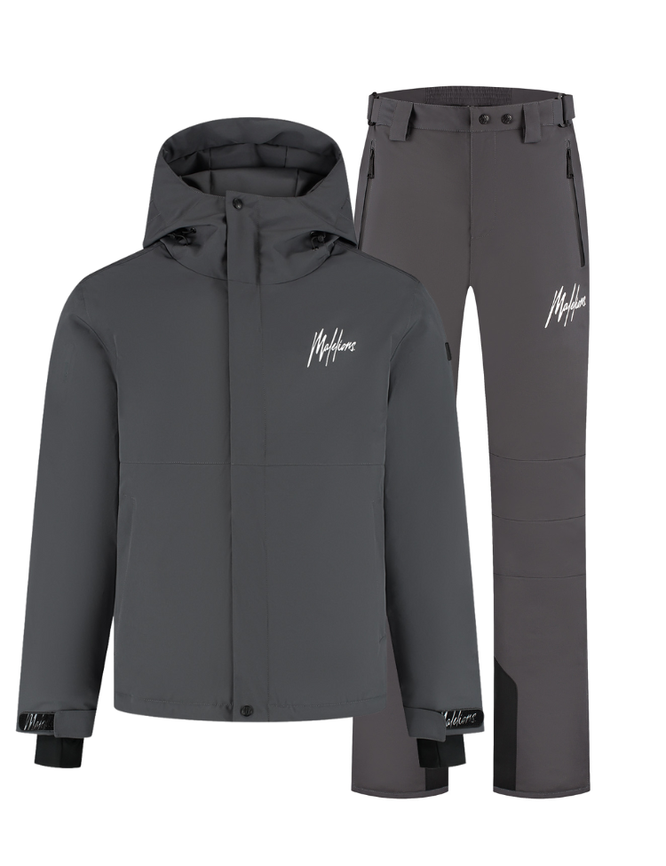 Deze winterse combi-set bestaat uit een ski-jas met vaste capuchon en bijpassende skibroek in antraciet. De jas heeft een doorlopende ritssluiting met drukknopen aan de voorkant en elastische manchetten met duimgaten. Op de borst staat het kenmerkende Malelions logo in wit handschrift. De skibroek beschikt over twee steekzakken en een dubbele sluiting met ritsen en drukknopen. Beide items zijn voorzien van een waterafstotende coating en getapete naden voor optimale bescherming tijdens je wintersportavontuur.