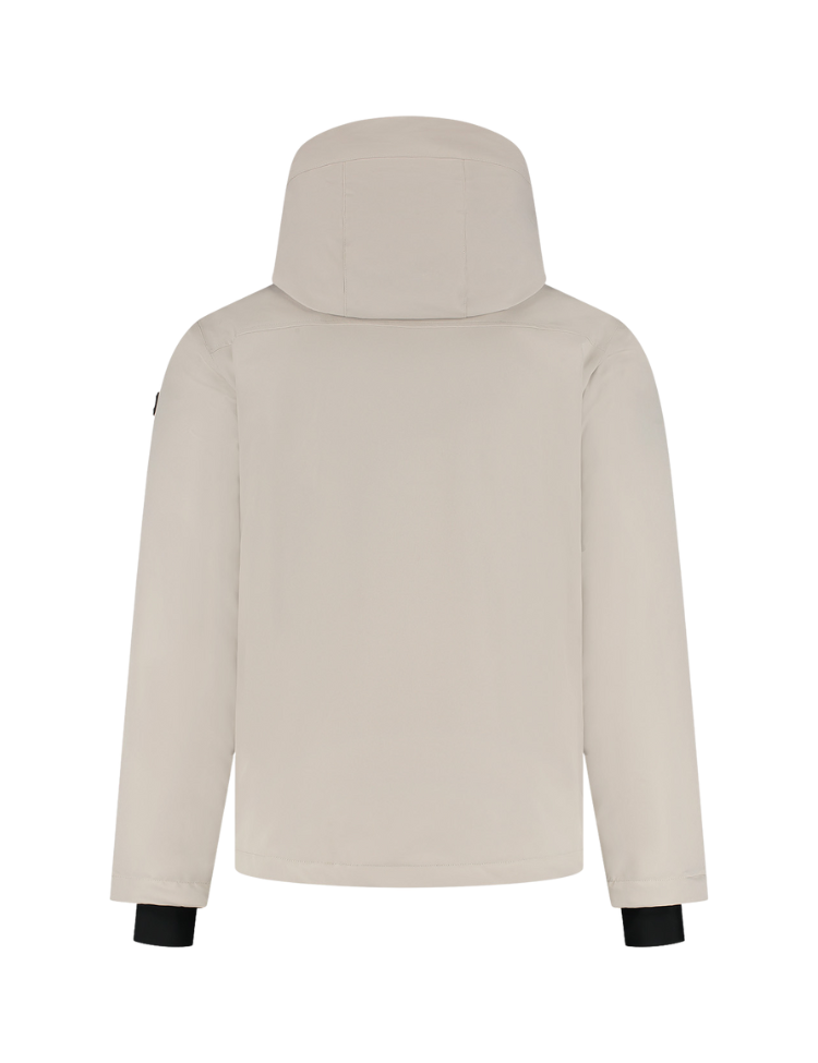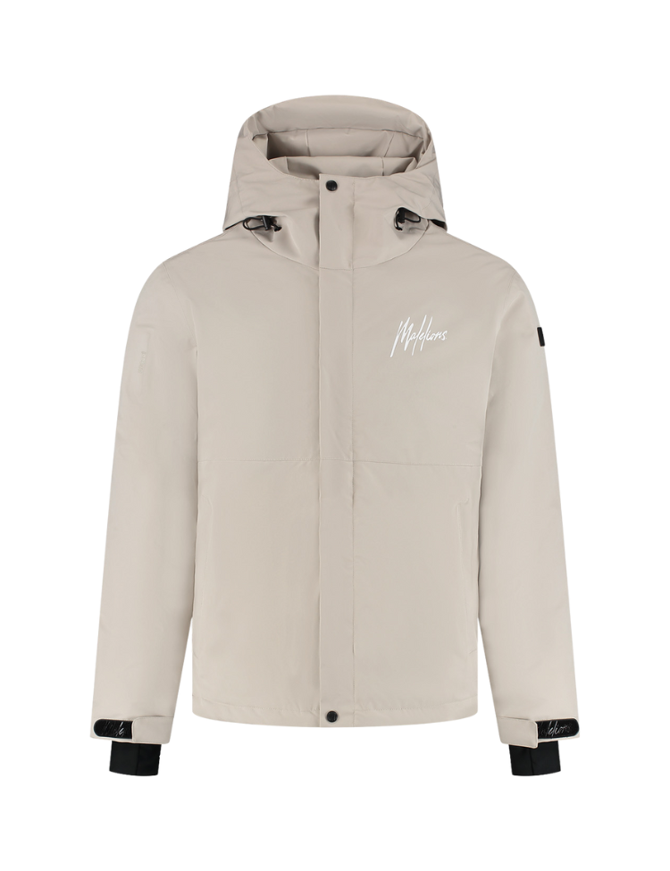 Deze technische ski-jas combineert functionaliteit met stijl. Het crèmekleurige jack heeft een waterafstotende buitenlaag en verstelbare capuchon voor optimale bescherming. De drukknoopsluiting met onderliggende ritssluiting zorgt voor extra windbestendigheid. Subtiele Malelions-branding op de borst geeft je winteroutfit die kenmerkende streetwear touch. Contrasterende zwarte manchetten bij de polsen en verstelbare koordjes in de capuchon maken het plaatje compleet. Perfect voor op de piste én in de stad.